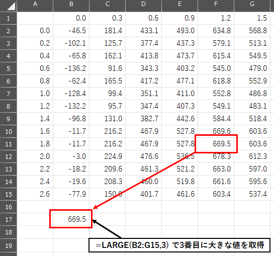 Excelで2次元分布データのn番目最大値を取得