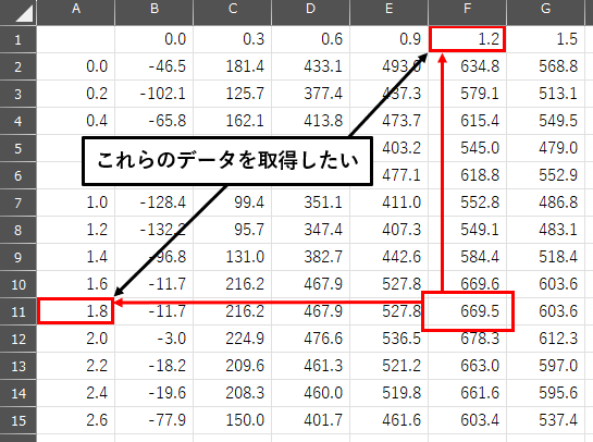 ここで、その “669.5” に対応する行の値(1.8)と列の値(1.2)を取得する方法を考えます。