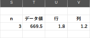 S3セルにnの値を入力し、T3セルにn番目に大きな値、U3セルにそれに対応する行データ、V3セルに列データを算出します。